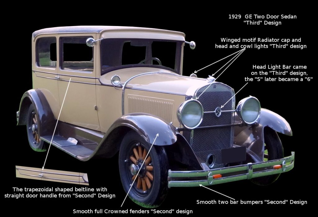 The early Dictator’s were referred to as “First” design models, and their bodies were nearly identical to the EU Dictator’s.  Over time Studebaker was gradually adding full crowned fenders, new smooth two-bar bumpers, and a new body trapezoidal belt line treatments, similar to the Commanders and Presidents.  These running changes and were not implemented at the same time on on all body styles.  These modified car are referred to as “Second” design.  This makes today’s identification of these early GE models very difficult, but they are generally all referred to as 1928 models.  The “Third” design models started with Studebaker’s 1928 mid-year face lift (August of 1928) of all the lines, and at this time Fafnir ball bearings were added to spring shackles ( Dictator’s, one year only).  Presidents, Commander’s, and Erskin’s acquired new model designations, but the Dictator’s remained as the GE.  However most reference the “Third” design as 1929 models.  The following indicators help in identification of the varies GE versions.