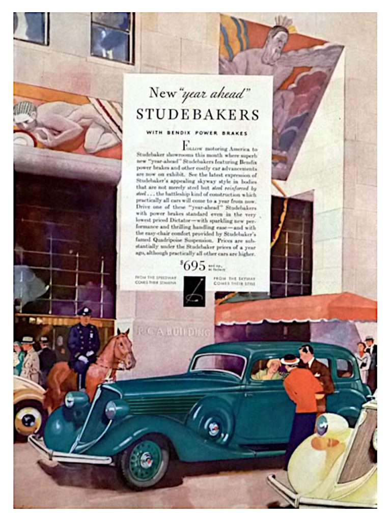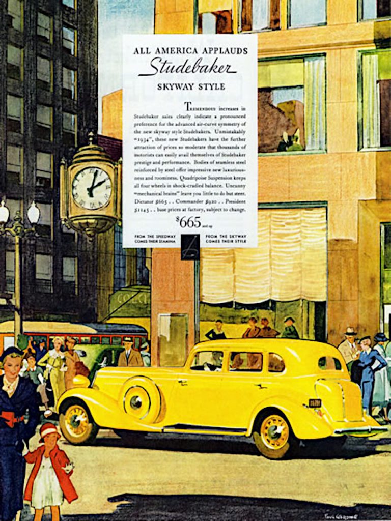 In 1932 Studebaker lost money on total sales of $46 million. The largest sales loss was in the eight cylinder cars, thus for 1933 at least one of the lines had to go, hence no Dictator’s were produced in 1933. In 1934, in a bold move, all the lines received all new body designs. Considering the receivership, this was quite remarkable. The Studebaker Six and Rockne are gone, so the Dictator is brought back as a six cylinder model, using the power plant from last years Rockne, with a ½ inch larger bore, developing 88 HP. In addition to streamlining the bodies, many interior changes are made, added are ash trays, hand grips, concealed rear curtains, adjustable interior visors, and a new instrument panel design with provisions for a clock and a radio. The steering wheel was finished to match the interior trim. Front vent window appeared, along with outward swinging rear side windows, outward swinging windshield, and large cowl ventilators, creating an all new ventilation system. Headlights were improved and a rather unconventional Midland Steeldraulic braking system was standard on Dictator’s. In June, Studebaker announced a new “Year Ahead” series in all it’s lines. The cars were slightly restyled and the Dictator’s were fitted with power-boosted brakes, of the type already used on the Commander’s and Presidents. A new Land Cruiser Dictator was added, which featured swept back styling, with full-skirted rear fenders, and rear window treatments similar to the Pierce-Arrow Silver Arrow. The famous bird mascot introduced in 1932 is now standard on all Studebaker lines. TCCD listed seven body styles for 1934. Added to the list below (not found on TCCD) is the brand new “Year Ahead” Land Cruiser with pricing and production data from Turning Wheels feature article by Fred Fox, December 2003. Fox indicates that 407 Dictator Land Cruisers were made, none have survived.