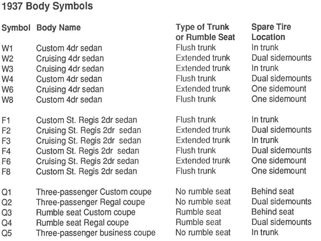 The chart below lists the body codes available for 1937 Studebakers.