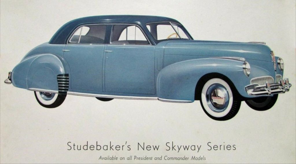 In the spring of 1941 Studebaker introduced a new trim series called the Skyway.  The exterior Skyway trim is considerably different then Custom and Delux-tone models.  Obvious difference was the lack of the dual side moldings.  Other features included, rear fender skirts, front fender top lamps, bright metal trim around the windows, trimmed rear fender stone shields, and rocker panel trim, extending onto the fenders.  The Skyway models were mainly painted two-tone.