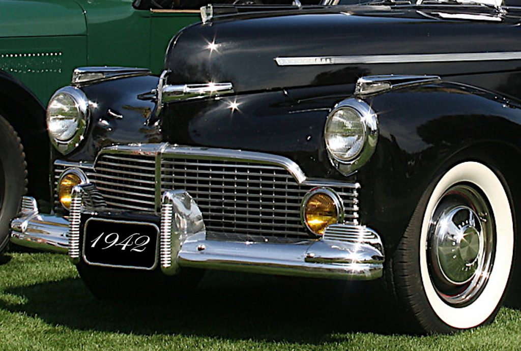 1942 Commanders have a new stainless grille that covered the entire front of the car, with horizontal bars emphasized and the vertical bars as background. The grill had two round blank spots, below and slightly inboard from the headlights, used for optional fog lights. Massive new bumpers and bumper guards with built in license plate holder front and back.