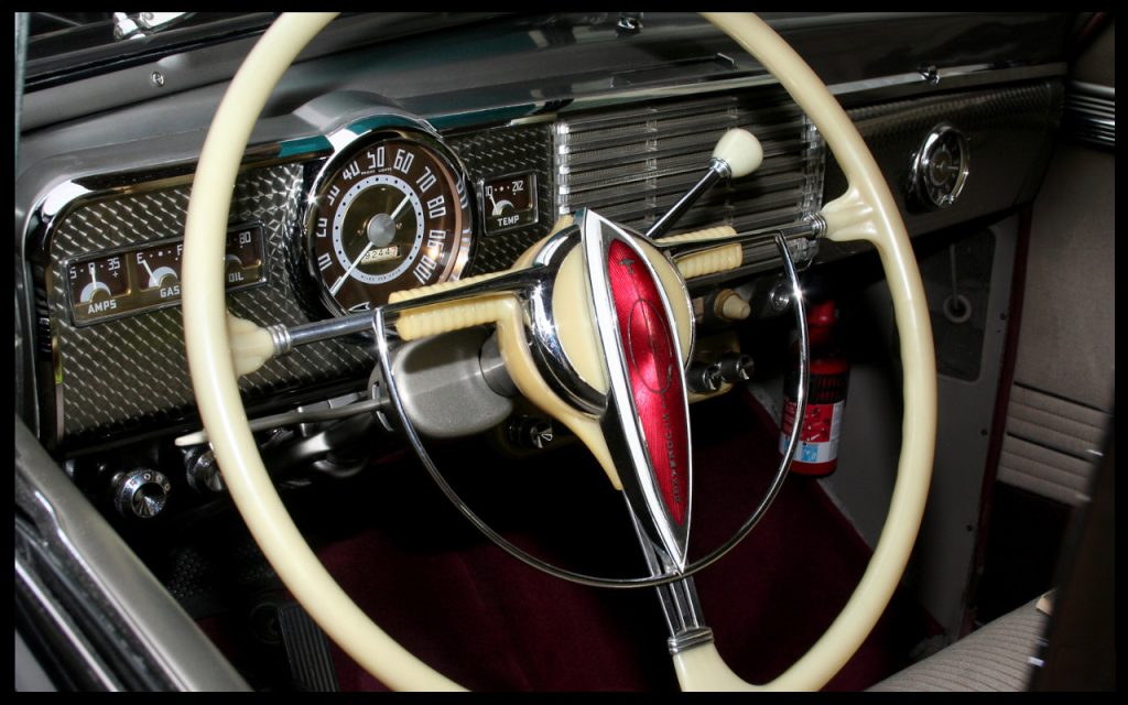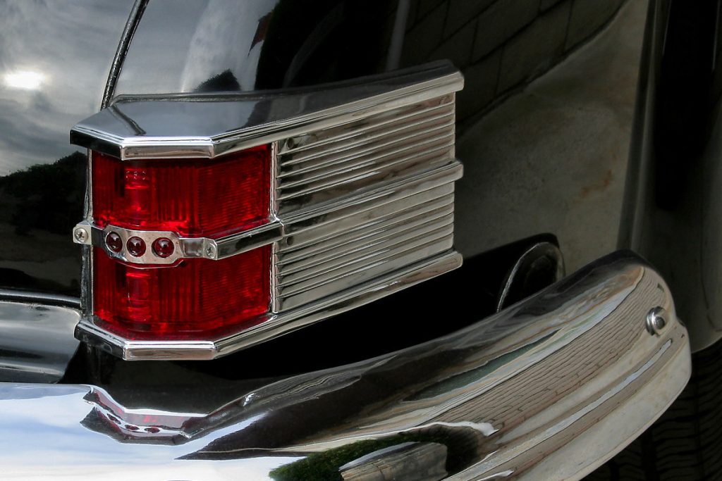 Large new horizontal tail lights, wrapping around the rear fenders, inside large chrome housings, with dual lamps, one for flashing indicators and the other for tail light/brake light. New hood ornaments, trunk and hood badges, and trunk handle were in place. Parking lights were found on top of the front fenders in long chromed housings’. The only bright work, not new for 1942, was the headlight rings.
