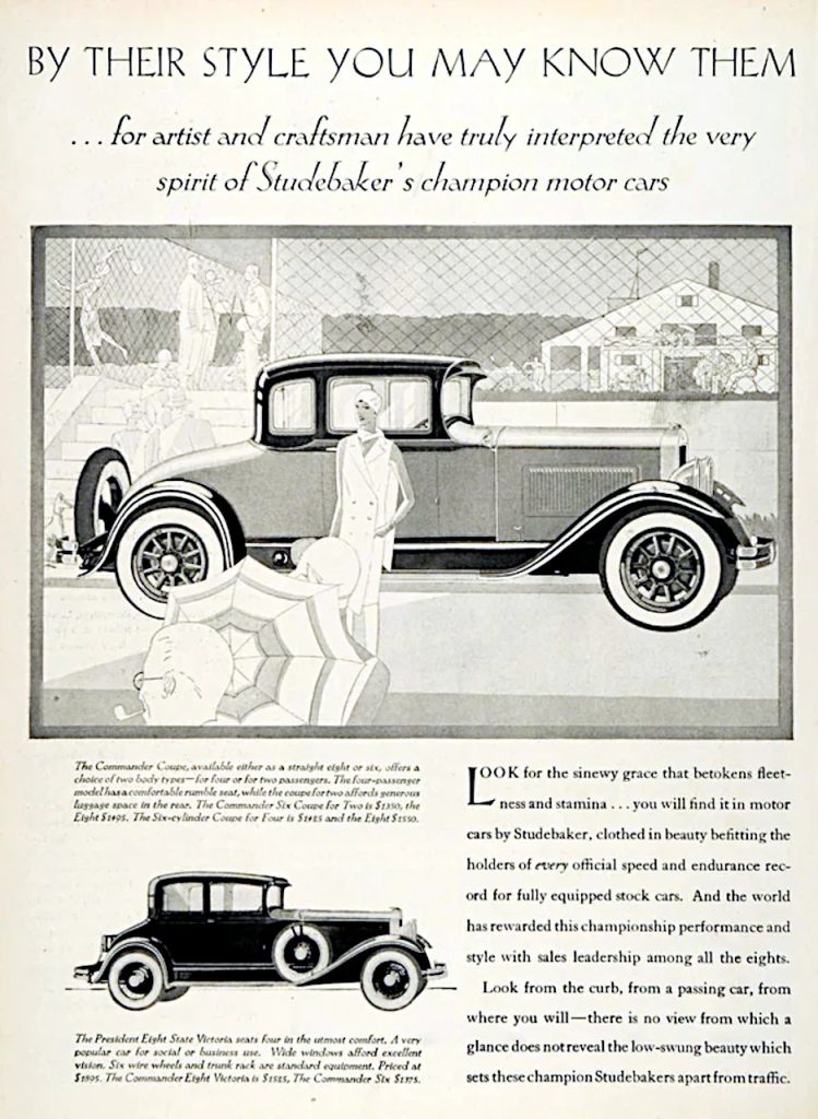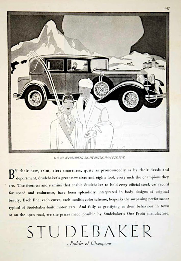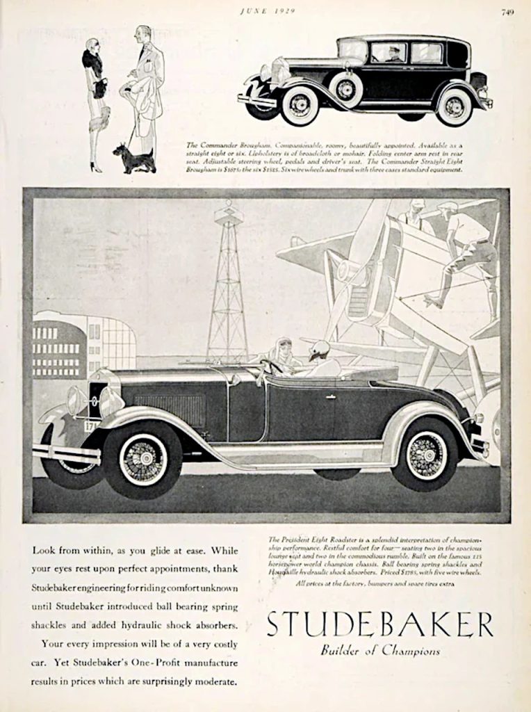 Introduced in January of 1929, the FE/FH models featured longer and lower lines, resulting from the new double-drop frame, and a new belt line. The wheelbases of the FE/FH are increased to 135 inches and 125 inches respectively. Both models are powered by the FE engine, now making 115 HP, resulting from raising the compression ratio to 5.1 to 1, a new carburetor and choke designed, and new intake and exhaust manifolds. The brake size is increased to 15 by 2 ½ inches and the rear axle is completely redesigned for quietness and durability. The new Brougham is available only in the FE line while the Roadster and Cabriolet are offered only on the FH line. New colors were offered and new comfort and safety options included, adjustable seats, adjustable brake and clutch petals, double acting hydraulic shocks, and safety glass. Studebaker really played up the “immediate running change improvement” motto as being the best policy for the buyer, instead of waiting for model year improvement in 1930, as they were not providing a new model design for that year, also pointing out the low cost of their existing line up which had been reduced in 1929 by as much as $250. Releases and improvements for 1930 did however include a new body style, the State Victoria, new muffler design, valve spring dampeners, and automatic radiator shutters. The distinctive feature of all 1930 President’s, is the French front windshield treatment without visor.
