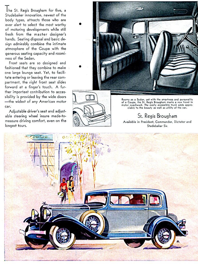 For the first time since 1928, Studebaker would offer only one Model in the President line, the Model 91, running on a one inch shorter chassis then the Model 90 of 1931, at 135 inches. Again the visor is eliminated and the windshield further slanted. The radiator grill is more wedge-shaped and sloped at the bottom. Standard wheels are ten-spoke, 18 inch, steel artillery type, while wire wheels are optional. New mechanical features include the Startix automatic starting system, a syncro-mesh transmission, and single plate clutch replaces the old duel set up. The engine is now mounted on rubber at all four points, requiring the clutch and brake petals to be mounted to the frame instead of the clutch housing. A vacuum-controlled spark advance is also introduced. Houdaille shock absorbers are introduced as well. Two new body styles are available, the St. Regis Brougham and the Convertible Sedan. The Tourer is dropped from the line up.