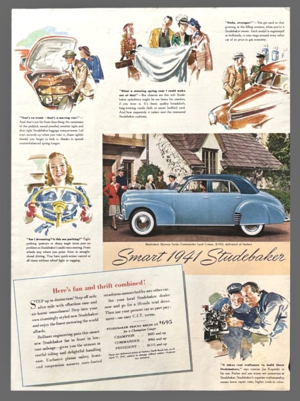 →The 1941 7C Series President started production in August 1940. It finished production in August of 1941. Studebaker assigned 6,400 SB serial numbers and 700 LA serial numbers to the 7C series. Engine Serial Numbers, B-45,501 to B-52,100. Most of the data in the chart is from “This is a Studebaker Year – Vol. 3”.← 7C series serial numbers would suggest production of 7,100 cars. Both TCCD & SCAC reported 6,994. The prices for series 7C cars come from TCCD & SCAC were both agreed. While Cannon lists two Coupe Sedans, three Cruising Sedans, and three Land Cruisers, TCCD listed three Cruising Sedans, one Land Cruisers, and one Coupe Sedan. TCCD also listed a Custom Limousine Cabriolet at $1,160 and a Delux-tone Limousine Cabriolet at $1,225. However, we know there were to Cabriolets made by Studebaker for 1941.