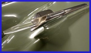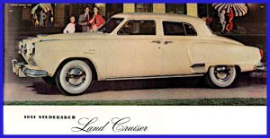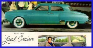 Bourke’s new design involved a new front end with three protruding noses.  The outer two were extensions to the front fenders.  The center nose would included the now famous four blade chrome bullet spinner, inside a large chrome outer ring with “Studebaker” stamped on the top ½ of this ring.  The rear fenders are reshaped to take new vertical tail lights.  Commanders would be a little more then ten inches longer then the Champion and run on a 120 inch wheelbase (Land Cruiser rode on 124 inches while Champions rode on 113 inches).  Commanders also have much larger headlight rings, larger bumper guards (on the same bumpers seen in 1949), and had more rounded tail light.There is a new hood ornament, a winged chrome piece with a clear lucite spear.  Front bumpers are mounted on extended supports and encased in round tubes.  The door handles are smooth, the grooves seen in 1947 to 1949 are removed.  A “Coat of Arms” badge is placed in the center of the hood between the hood ornament and the “Bullet.”  The model badge “Commander” is found on the side of the front fenders, except Land Cruiser, which of coarse had a “Land Cruiser” badge in the same location.  Smooth moon style hubcaps with the “Studebaker Commander” name along the edge, would be seen on early models.  Land Cruiser would have “Studebaker Studebaker” on their caps.  During the mid-year changes, the headlight rings would become chrome plated.  New plain small hubcaps (without lettering) or a plain full wheel cover that looked like the smaller caps with full width trim rings were also seen.  Full wheel covers with the “Coat of Arms” badge in the center were also offered as an accessory.  These mid-year changes were not necessarily implemented at exactly the same time, so while a car might have new chrome headlight rings it also may have came with the older lettered hubcaps.