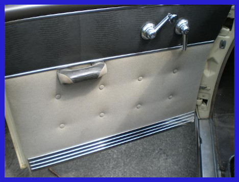 Closed cars (sedans & coupes) have plain fabric door panels on DeLuxe trim or a combination of fabric with leatherette accents for Regal DeLuxe trim.  The door panel accents for Regal DeLuxe would be a Gray Snake Skin pattern, similar to the Brown Alligator accents seen in 1949.  The convertible would were trimmed in color co-ordinated leatherette (real leather at additional cost.)  The Land Cruiser would have tucked seats with fabric buttons and those same buttons would appear on the door panels.