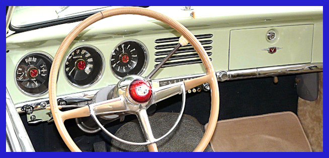 Interior changes involve a new dash.  The same basic layout is seen, the instruments are on the left, radio grille in the center, and glove box on the right.  The panel has three round instrument openings, the left holds four gauges (oil, amps, heat,and gas), the center the speedometer, and the right a clock (if equipped).  An upper dash cap extends out over the main dash section, making the lower main section look recessed.