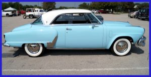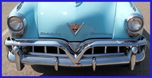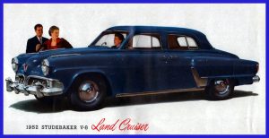 In the 1950 to 1952 Studebaker series “52” would be the only year without a bullet nose, making them very easy to identify.  The deep “V” in the grille is a significant tell for 52’s and a sign of what the future was going to bring.  Hooded tail lights also signify 1952 Studebaker’s.  We know that Commanders and Champions are running on the same wheel base and use the same sheet-metal (except the Land Cruiser).  So, in the front look for the Commander script on the lower edge of the hood and from the rear look for the “Commander” or “Land Cruiser” deck lid script and the V8 badge, if they are not found, it’s a Champion.  From the side no known tells.  If the car has a rubber gravel shield, it’s a Regal trim, but if the gravel shield is stainless it is State.