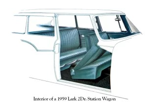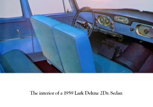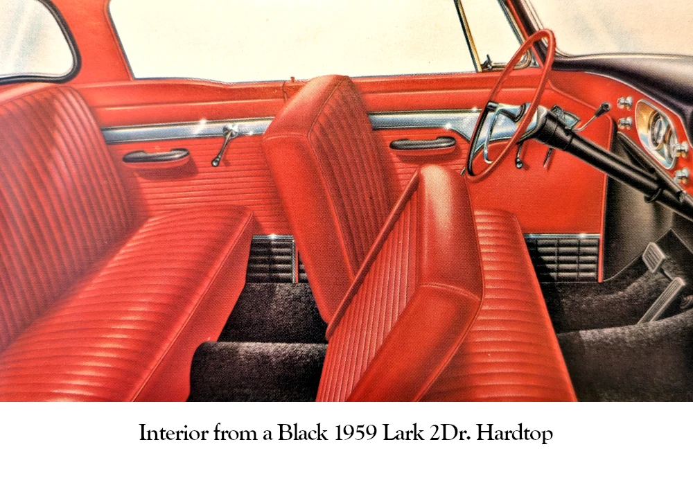 The 1960 Lark interiors were for the most part color coordinated with the exterior colors. The upholstery was a combination of vinyl and fabric or total vinyl very similar to 1959 Larks.