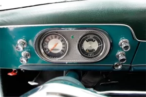 The interior design continues with the center glove box, but the cyclops eye speedometer is gone, replaced by a flush mounted circular speedometer, and another round gauge housing containing fuel & temp gages and oil & amp “idiot lights” inside an engine turned oval surround.