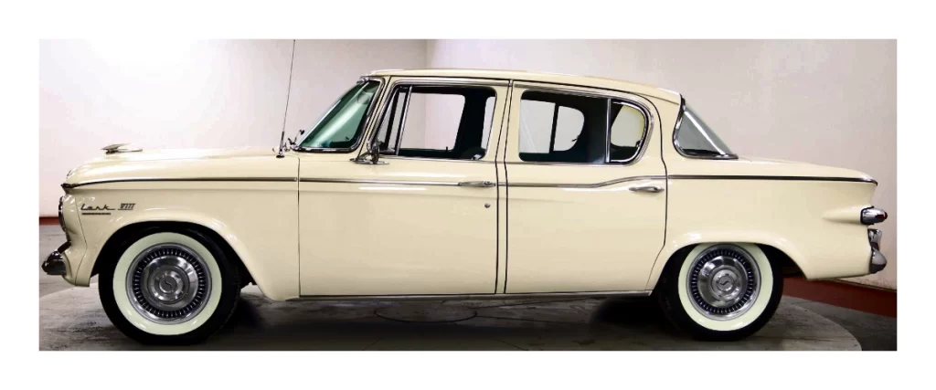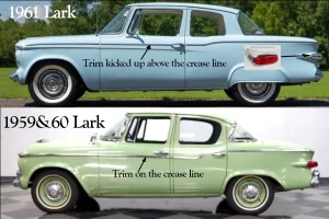 Quick Tells: 1960 Larks have VI or VIII badges on the front fenders. 1959 Larks have “Studebaker” front fender Badges.