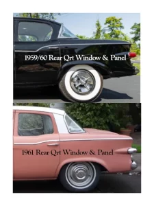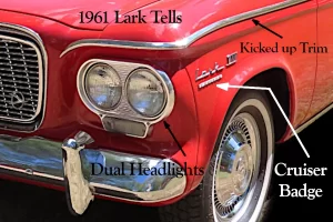 Quick Tells: 1959 Larks have “Studebaker” front fender Badges. 1960 Larks have VI or VIII badges on the front fenders.