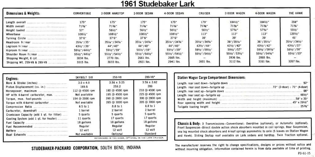 Other than the necessary shorting of the frame and changing of the spring rates, mechanical changes from the 1958 models were few. One somewhat interesting change was to take the “six” back to 170 cubes, instead of the 185 it had been during 1955 to 1958. The change was most likely done to emphasize the Lark’s economy image, how else would Studebaker have been able to advertise its “new Lark Six!”. The V-8 option was also limited to the “259” in keeping with the economy theme. Transmission options were the same as 1958 models, two speed automatic, standard three speed, or three speed with over-drive. Hill Holder, Twin Traction, Power Brakes, and Power Steering were options. (Power Steering only on V-8 models). Climatizer and Air Conditioning options were also available on all models. The 14 inch wheels of 1958 are gone. All Larks would run on 15 inch wheels with new wheel covers.
