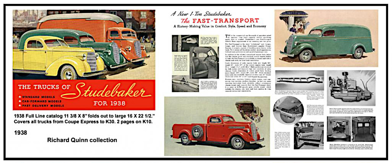 In 1938 Studebaker would also release the “Fast-Transport”, a new 1-ton pickup.  It came as a wide, steel floored, flat sided, “Express” body.  Later it would be available in Chassis & Cab, Chassis and Cowl, Custom Panel or Stake Body.  For 1939/1940 Studebaker would add a narrow box version which had none of the fender well inside the box.  It was dubbed the “Standard-Express” and the wide version would now be called the “Custom-Express”.  Interesting enough, the the wide version would become very popular in the 1960’s with the introduction of the “Fleetside” pickup box design (the entire fender well inside the box.)  Later yet, in the 1970’s, they would reintroduce the older style pickup boxes where the entire fender was outside the box and call them “Flareside”.  So, it would appear the “Fast-Transport” of 1938 to 1940 was way ahead of it’s time.
