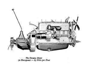 1930, (Model FC Dictator): the Dictator Straight Eight engine was a completely new engine design, patterned after the Commander Eight, but with a shorter stroke. It had a bore of 3 1/16 inch and a stroke of 3 ¾ inch (221 cubic inches), making 70 HP.