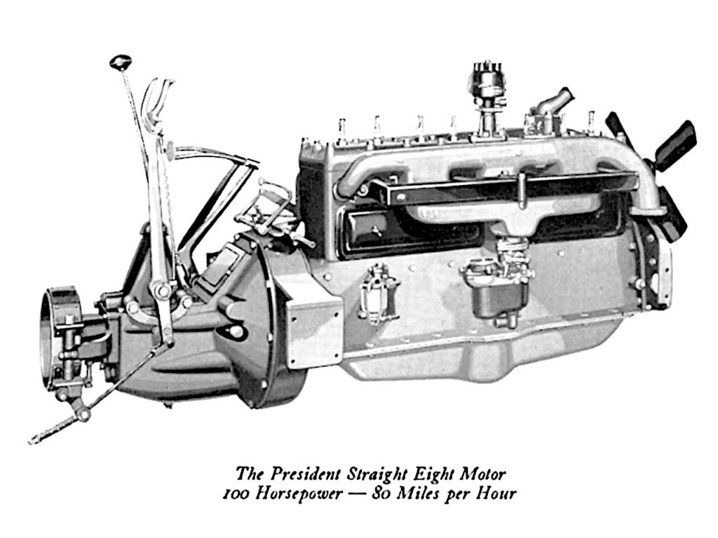 1933, (Model 82 President): in 1933, no Dictator Eight was manufactured, therefore, the Commander Eight used the Dictator engine, except bored out to 4 inches. This freed up the existing Commander Eight engine ( 3 1/16 x 4 ¼ – 205.4 cubic inches – 110 HP) for use on the Model 82 President.