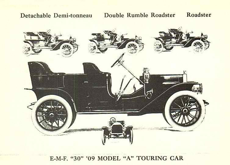 1909 | 30 | EMF | Touring, Demi-Tonneau, Roadster Single or Double, and Runabout | 4 | 30 | 106 | $1,400 / 7,960 |